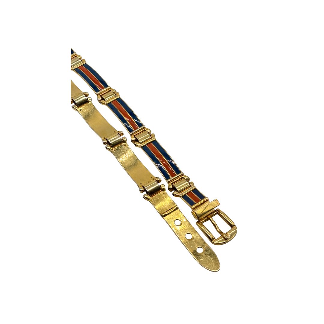 - Materiale/ Colore: metallo placcato oro smaltato in blu e arancione;